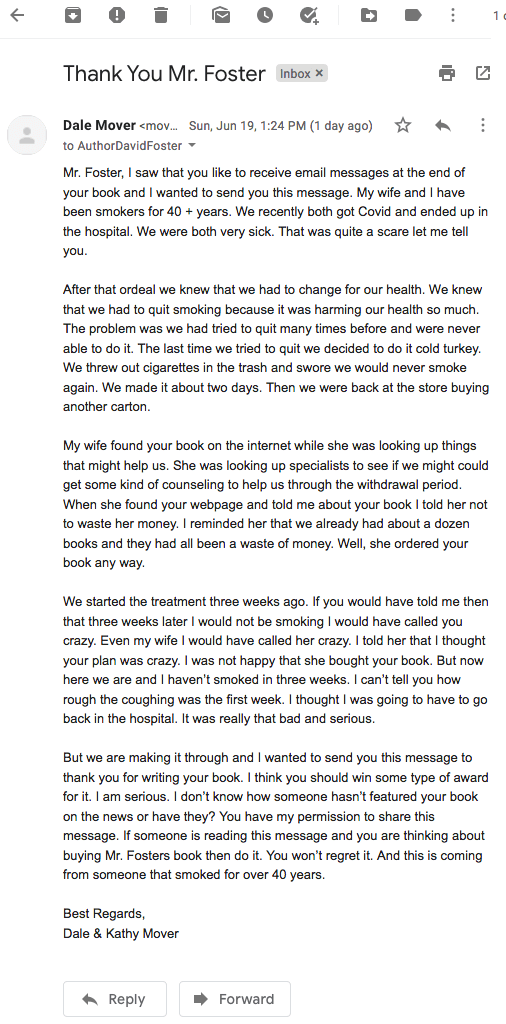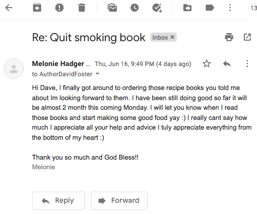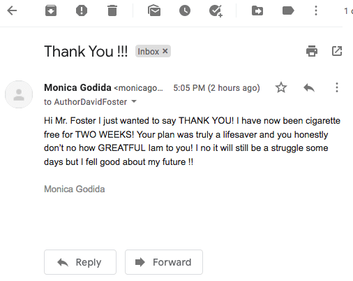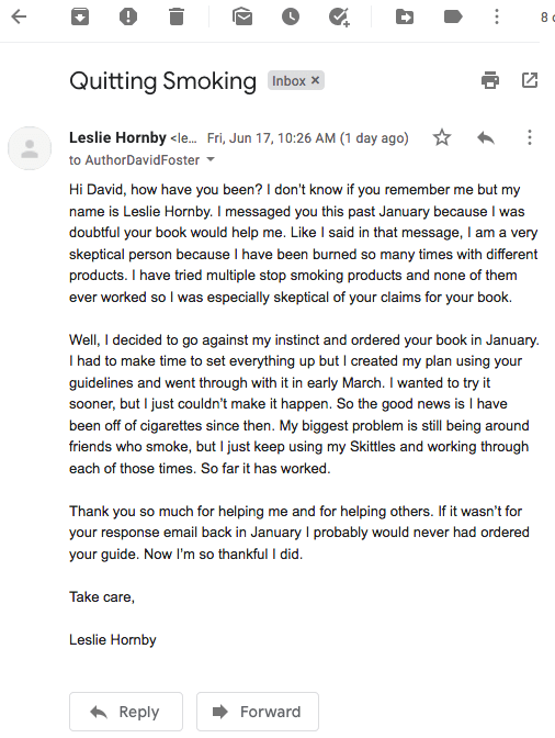 BTW, the author is really nice and answered every email I sent him. I wasn’t expecting that because I’m sure he gets a lot of emails every day. But he did, and his extra advice also really helped when I was going through the steps. I can defintely say I recommend this book if you have tried to quit smoking before but never had success with it.